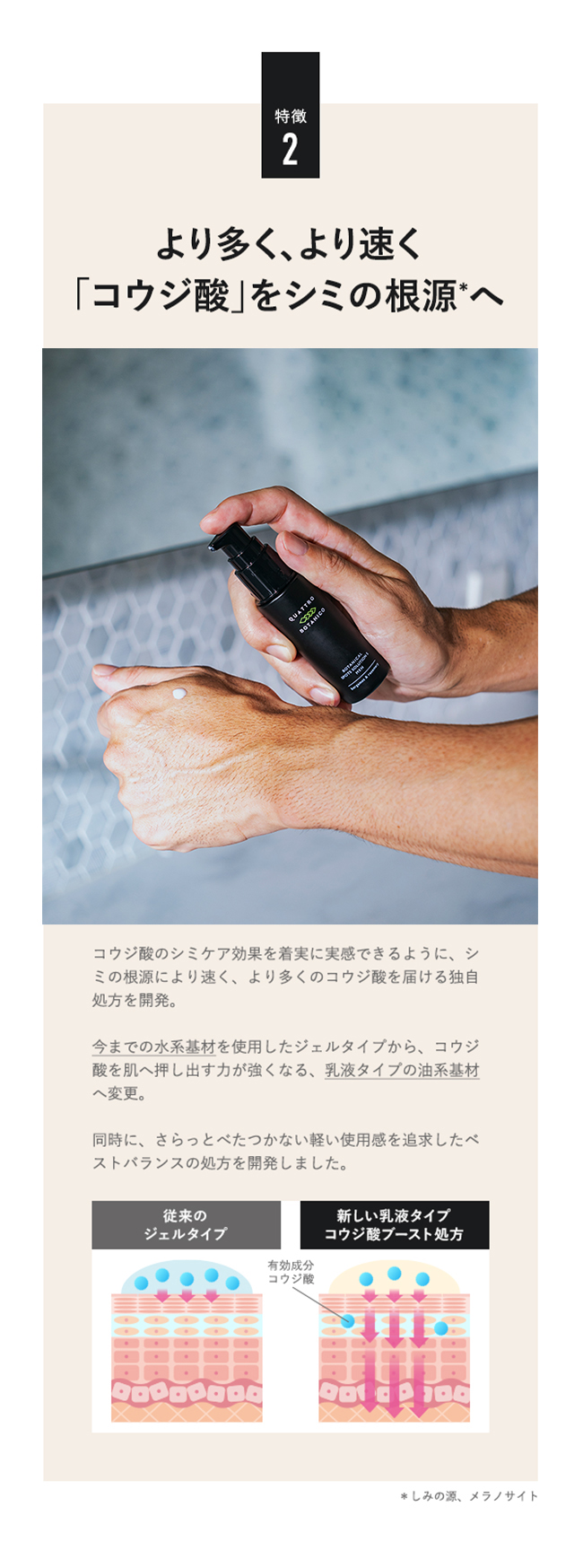 コウジ酸を、シミの根源(メラノサイト)へより多くより速く届けられる油系基材の乳液タイプ。 サラッとなじみやすく、肌にべたつきを残しません。