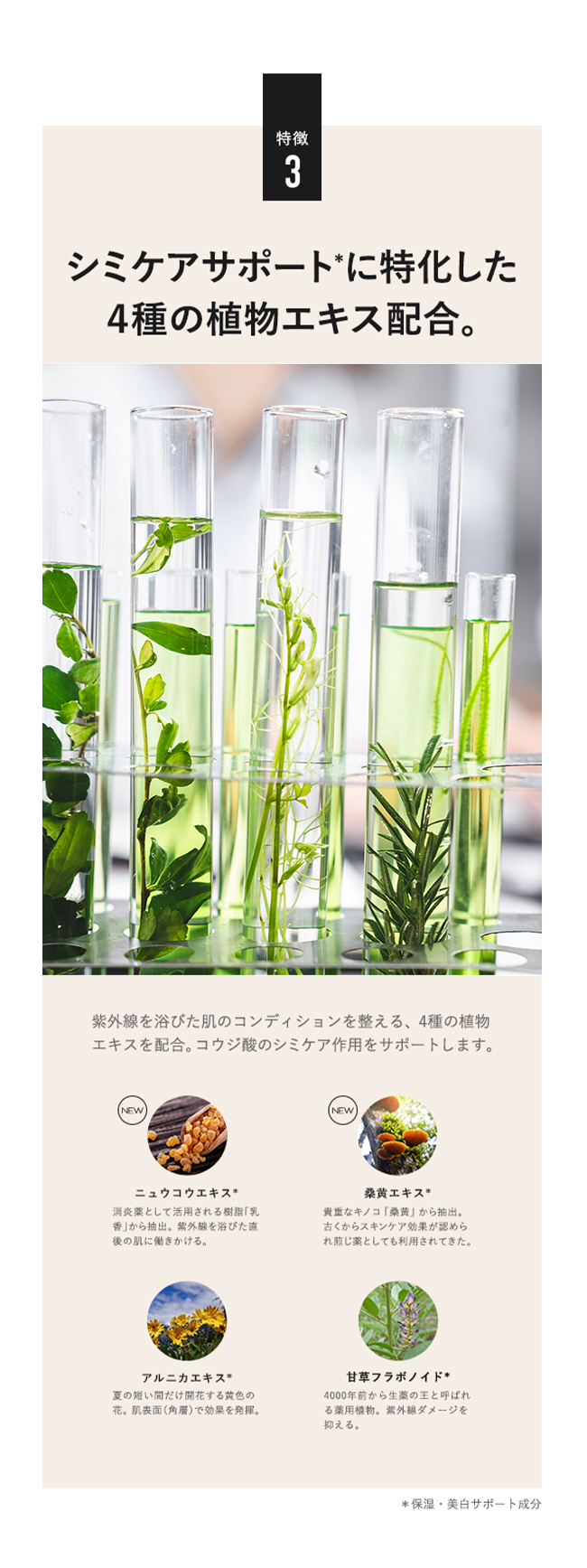 日本で唯一、シミ防止有効成分「コウジ酸」を配合した、薬用シミケア美容液