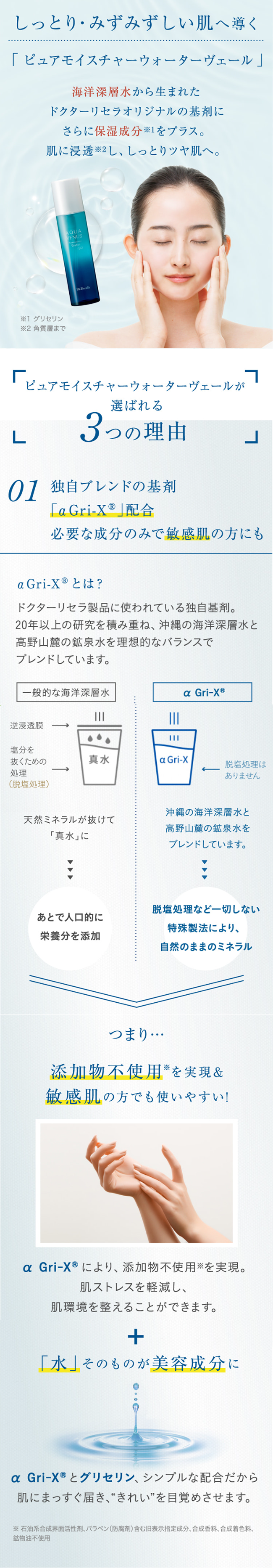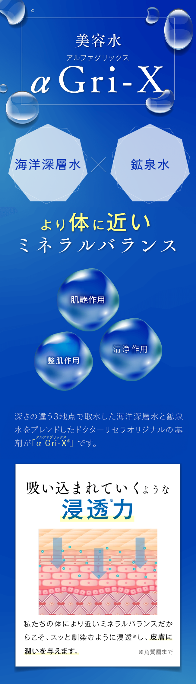海洋深層水から生まれたドクターリセラオリジナルの基剤「α Gri-X(アルファグリックス)(整肌成分)」に