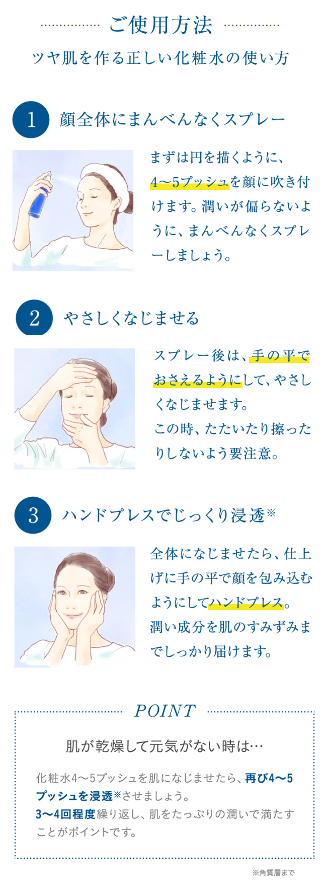 乾燥が気になる肌にしっかり潤いを与え、みずみずしい状態を長時間キープします。