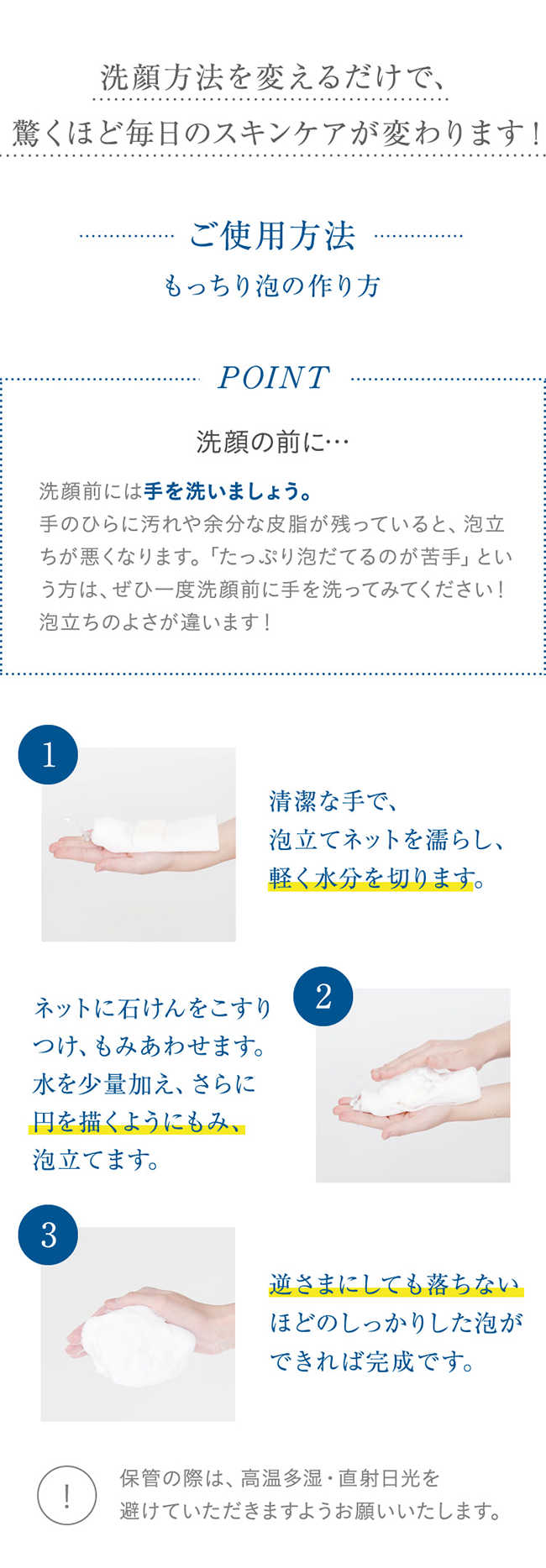 泡立てネットとソープをこすり、きめ細かなリンゴ1個分の泡を立てるためにご使用ください。