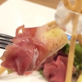 パルマ産生ハムと季節のフルーツ with ビアンカ ヴィーニャ スプマンテ 柔らかい酸味が特徴のスプマンテ、「ビアンカ ヴィーニャ」♪ イタリアンならではの美しいアンティパスト、 「パルマ産生ハムと季節のフルーツ」と相性抜群! 生ハムの脂と赤身の熟成味をやさしく包み込むかのように寄り添って、 セストセンソの世界へと心地よく誘います♪ 自家製グリッシーニに生ハムを巻きつけて、お洒落に味わって みてはいかがでしょうか? パルマ産生ハムと季節のフルーツ 972円 ビアンカ ヴィーニャ スプマンテ (ボトル 5,940円 / グラス 1,026円) |