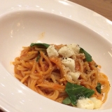 イカ墨を練りこんだタリオリーニネロ with ヴァッラロム シャルドネ イカ墨を練りこんだ細めの平麺をイカワタと トマトのラグーソースで味わうオリジナルの名物パスタ! イカワタの濃厚味に負けない深みある白ワイン、 「ヴァッラロム シャルドネ」で味わってみてください♪ イカ墨を練りこんだタリオリーニネロ 1,620円 ヴァッラロム シャルドネ ボトル 7,560円 / グラス 1,404円) |
