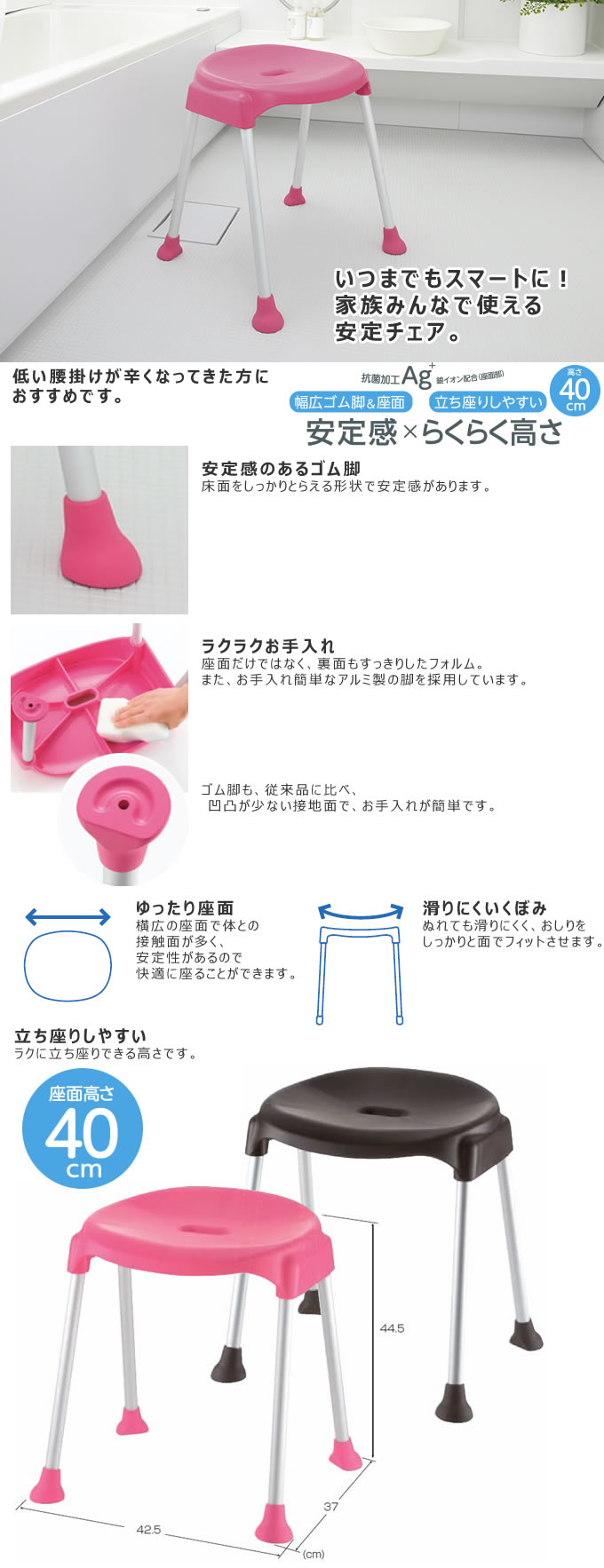★★ いつでもスマートに!家族みんなで使える安定チェア。★★ 低い腰掛けが辛くなってきた方におすすめ。立ち座りしやすい。座面高さ40cm。安定感のあるゴム脚。ラクラクお手入れ。ゆったり座面。滑りにくいくぼみ。抗菌加工。銀イオン配合。