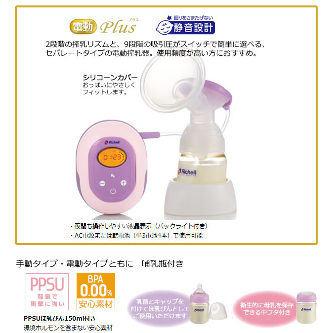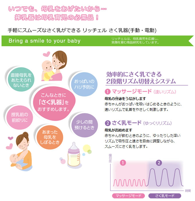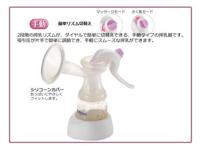母乳育児中のママさんへ!手軽にスムーズなさく乳ができる「リッチェル さく乳器」「リッチェル さく乳器」について詳しくは コチラ★★ さく乳器 手動 ★★価格/4,320円サイズ/20x9.1x20H(cm) 最大目盛容量/150ml 材質/ポリプロピレン、エラストマー、シリコーンゴム、ポリフェニルサルホン(PPSU)★★ さく乳器 電動 Plus ★★ 価格/12,960円サイズ/9x15x20.5H(cm) 最大目盛容量/150ml 材質/ポリプロピレン、シリコーンゴム、ABS樹脂、エラストマー、ポリフェニルサルホン(PPSU)、他