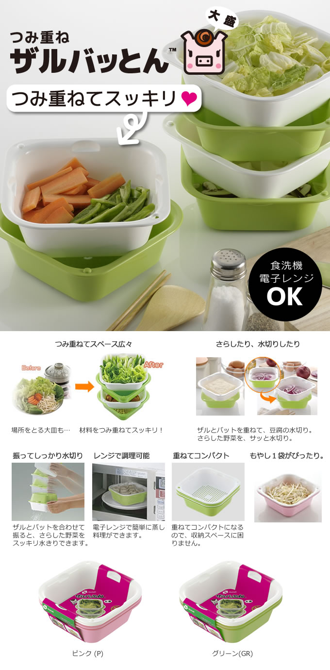 つみ重ねてすっきり! 「ザルバッとん 大盛」ザルバッとん 大盛は、調理の下ごしらえ時など、狭い調理スペースでも食材をつみ重ねてすっきり置ける便利なザルとボウルのセットです。