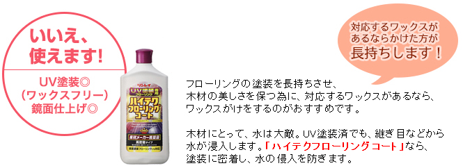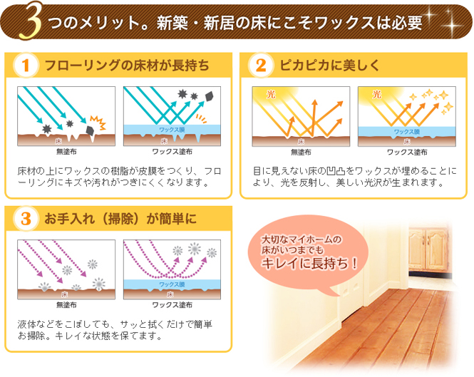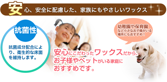 UV塗装(ワックスフリー)のフローリングにも高密着性・高耐水性を発揮する床材メーカー推奨の樹脂ワックスです。フローリングをキズ、シミ、汚れからしっかり保護し、抗菌性を発揮します。