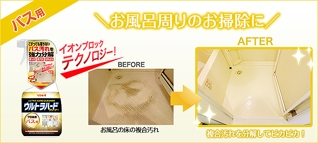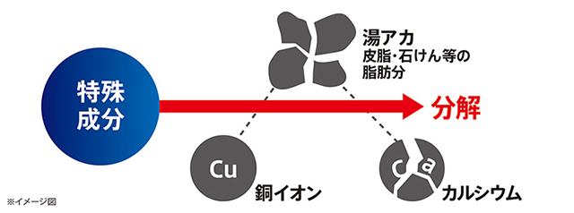 イオンブロックテクノロジー処方により、今まで諦めていた『湯アカ』、『水アカ』、『石けんカス』に加え、こすっても落ちない青ジミといった強烈なお風呂の汚れを徹底的に分解します。