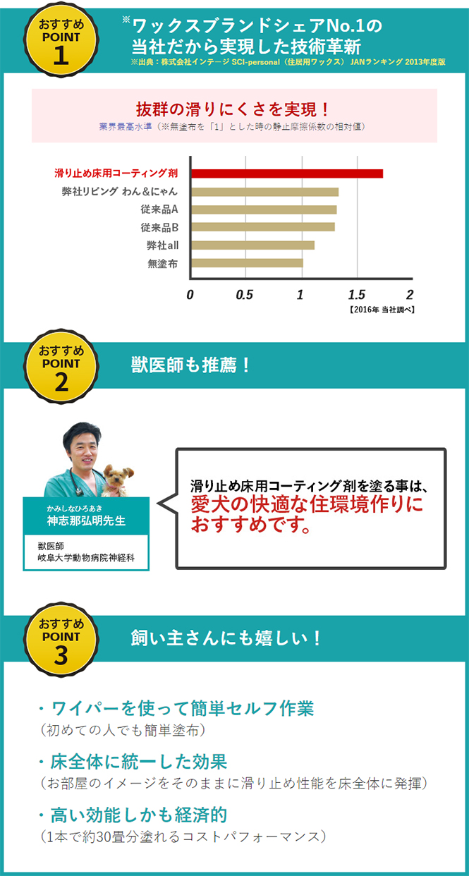 その性能は従来のワックスやフロアコーティングは勿論、マットや靴下、スプレーといった他の商材すらも軽く凌駕しています。