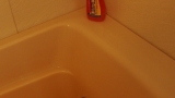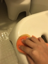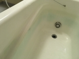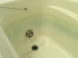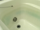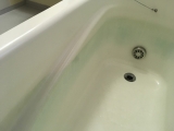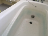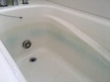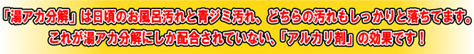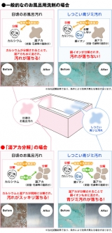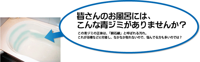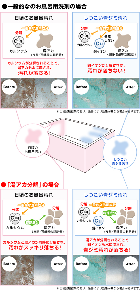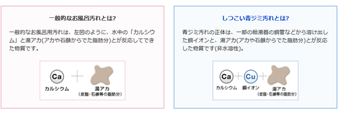 | 一般的なお風呂洗剤には、カルシウムを分解する性能を持った「キレート剤」という洗剤 成分が多く含まれています。 しかし、「湯アカ」や「銅イオン」には効果がないので、カルシウムによる普通のお風呂 汚れは落ちますが、「青ジミ汚れ」は落ちません。 日頃のお風呂汚れは落ちていますが、青ジミ汚れは落ちていません。(当社比) |