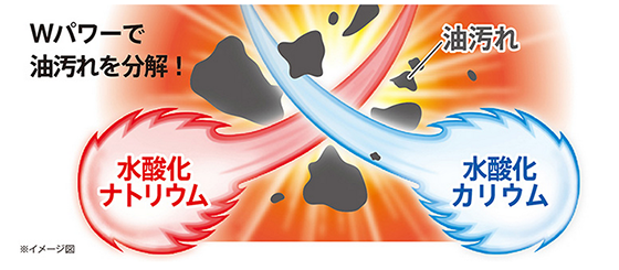 強力アルカリWパワー処方により、今まで諦めていた『ドロドロ』、『ギドギド』、『カチカチ』といった強烈な油汚れ、さらにはコゲまで徹底的に除去してます。