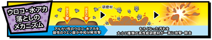 アルカリ性のウロコ・水アカ汚れを中和分解する、酸性のクエン酸を掛け合わせた超強力ハイブリッド処方を採用。