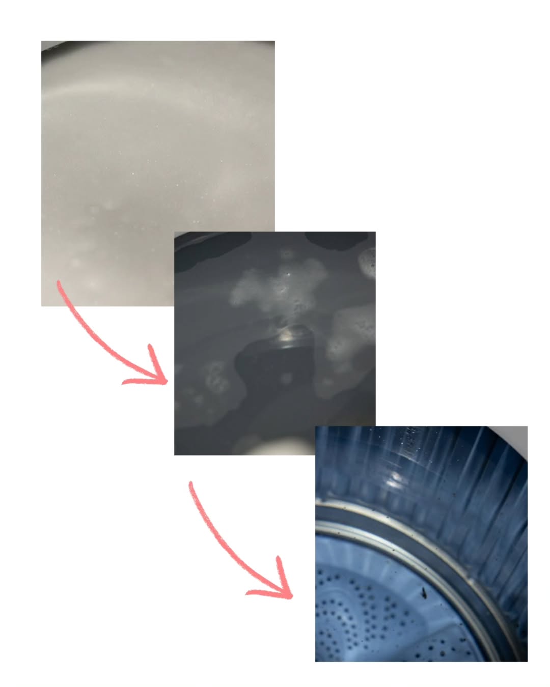 浸透剤で6時間程度つけ置きで洗浄剤を汚れにしっかり浸透させた後発泡剤を投入。泡の力で汚れを剥がしてくれます。
