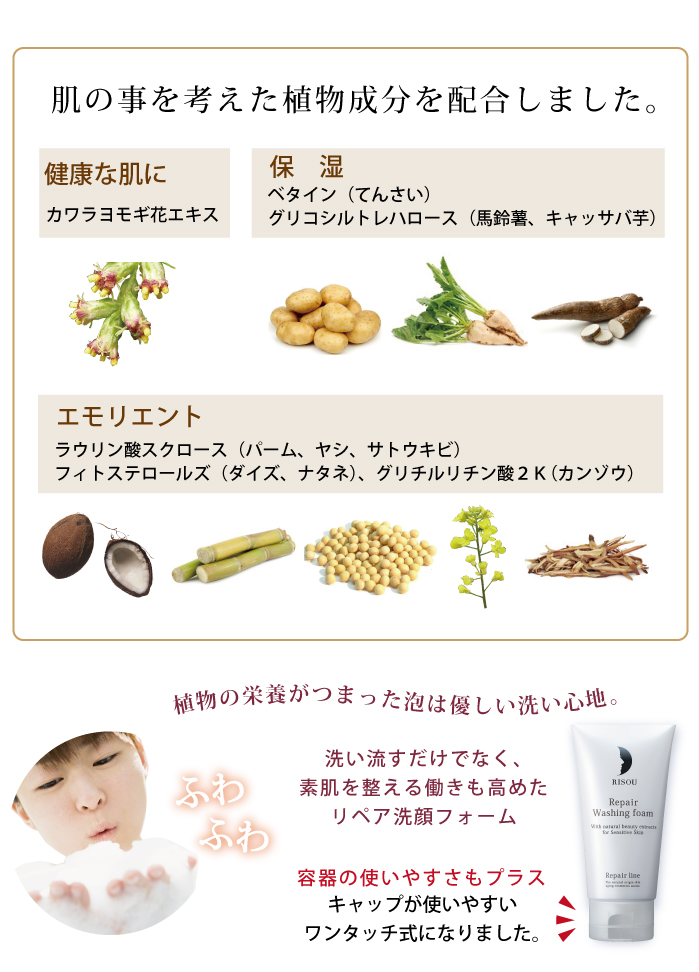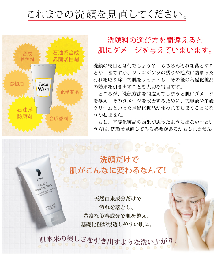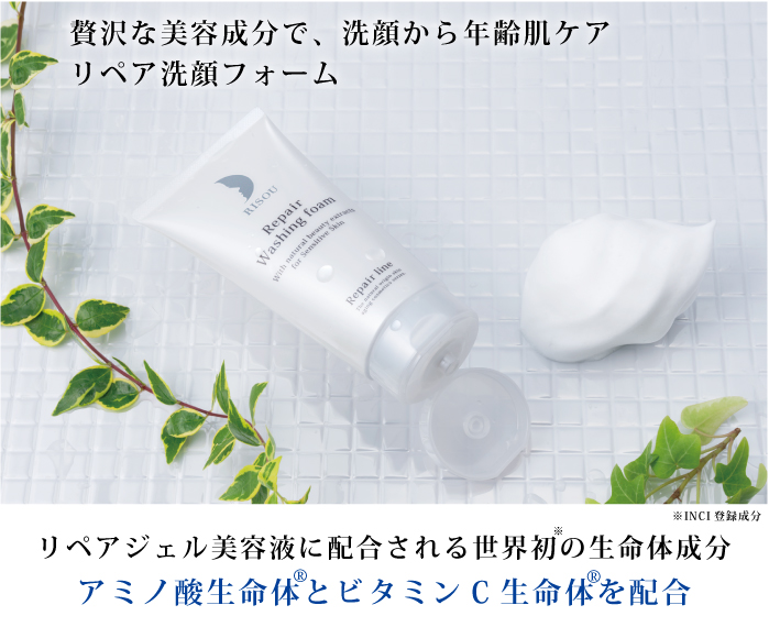 洗顔での負担は乾燥肌や敏感肌、そして肌老化を引き起こすことから注意が必要です。それに加えて、洗顔後に使用する基礎化粧品で本来の効果を実感できない可能性まで。こういった問題をクリアするために開発したのが、リペアジェルの生命体成分と100%天然由来処方により、美容効果と優しさを実現した洗顔フォーム。しっかりと毛穴の汚れや古い角質を落としながら肌を整えることで、基礎化粧品の浸透力を高める目的としてもご使用頂けます。