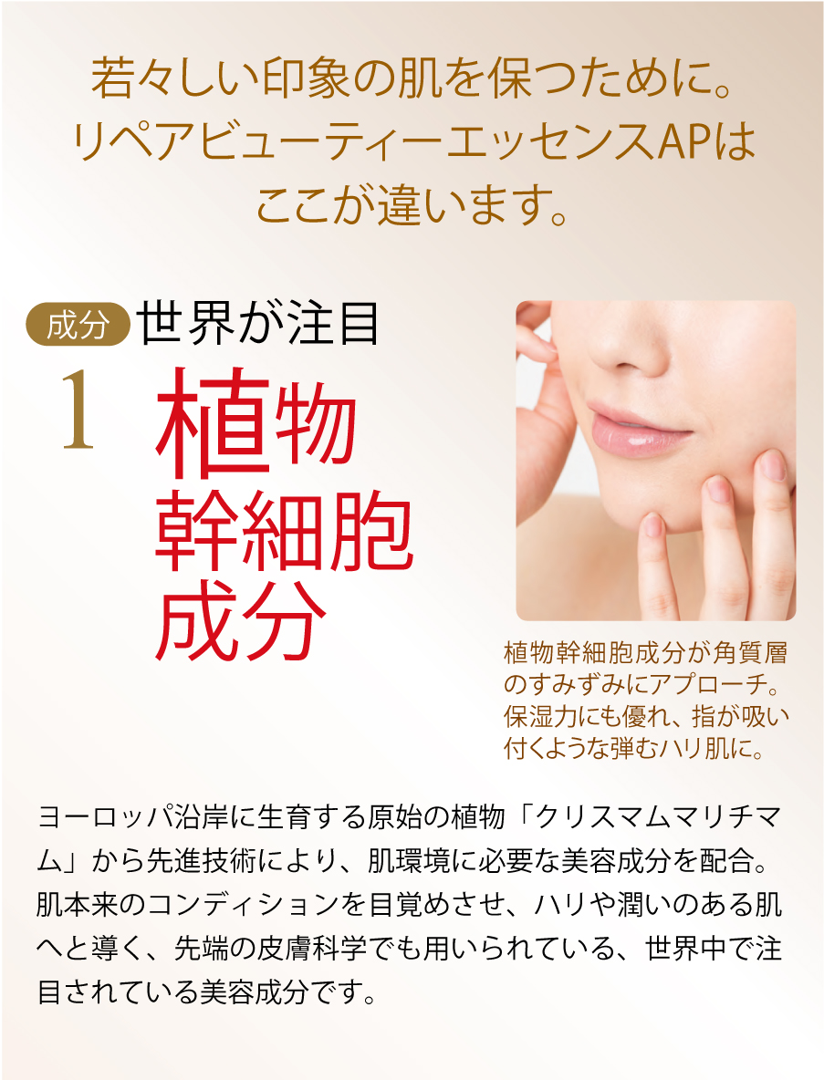 年齢によりコンディションが乱れがちな肌に、ハリや潤いの元となる植物幹細胞成分や女性に欠かせない成分を配合した機能性エッセンス。