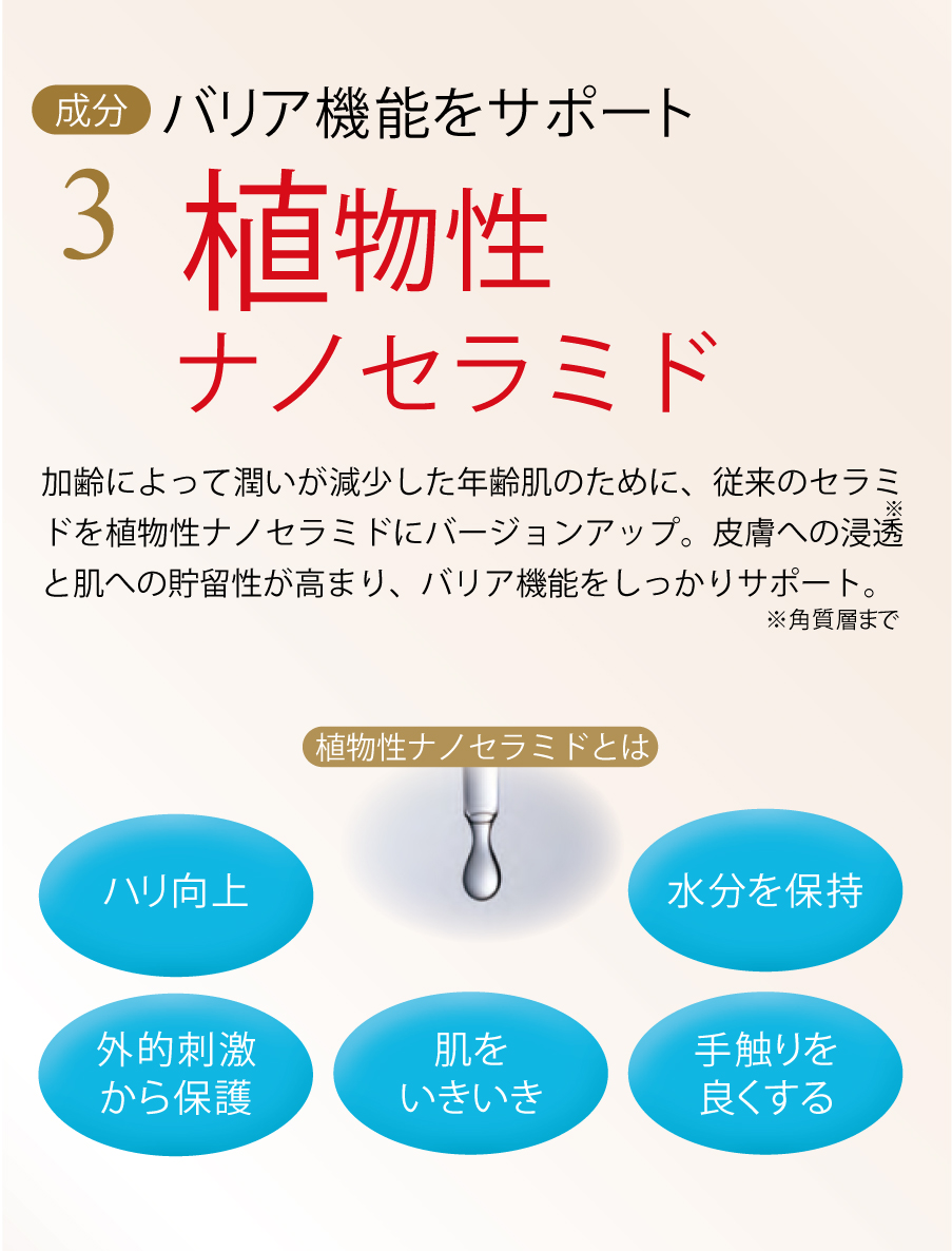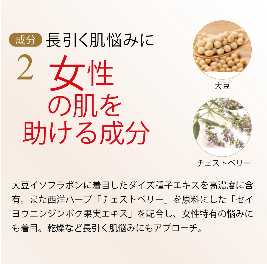 バリア機能のサポート作用のほか、女性特有の長引く肌悩みにも着目し、活き活きとした素肌へと導きます。