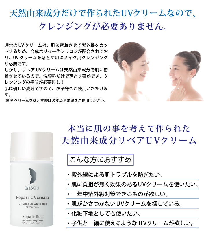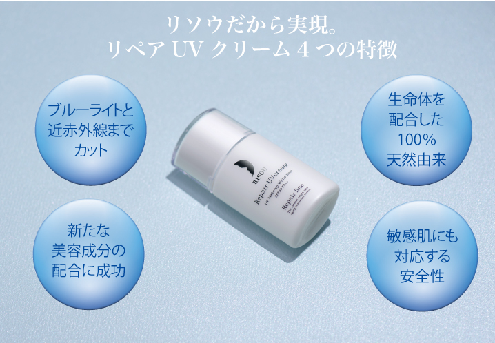 リペアジェルと同じ独自の生命体成分から誕生した100%天然由来のUVクリーム。素肌への優しさを考慮し、日常の紫外線対策に十分なSPF30・PA++で守りながら、付けている間に美容液効果を実現。紫外線でダメージを受けた素肌をケアし続けます。