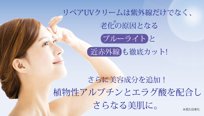 さらに、最近になって紫外線のほかにも肌を老化※1させる光として解明が進んでいる「近赤外線」「ブルーライト」もカットに成功。シミやハリ不足の原因から肌を守るUVクリームとして最高※2の製品が誕生しました。