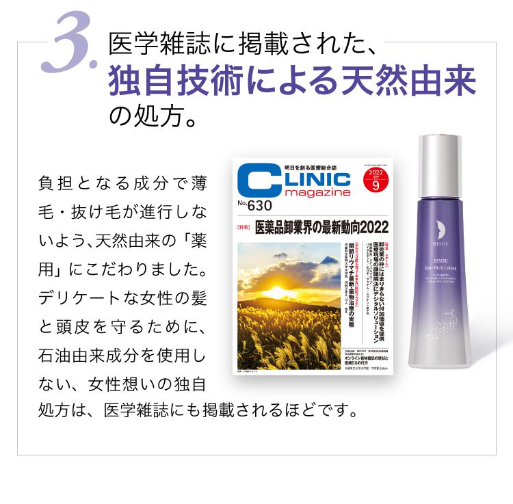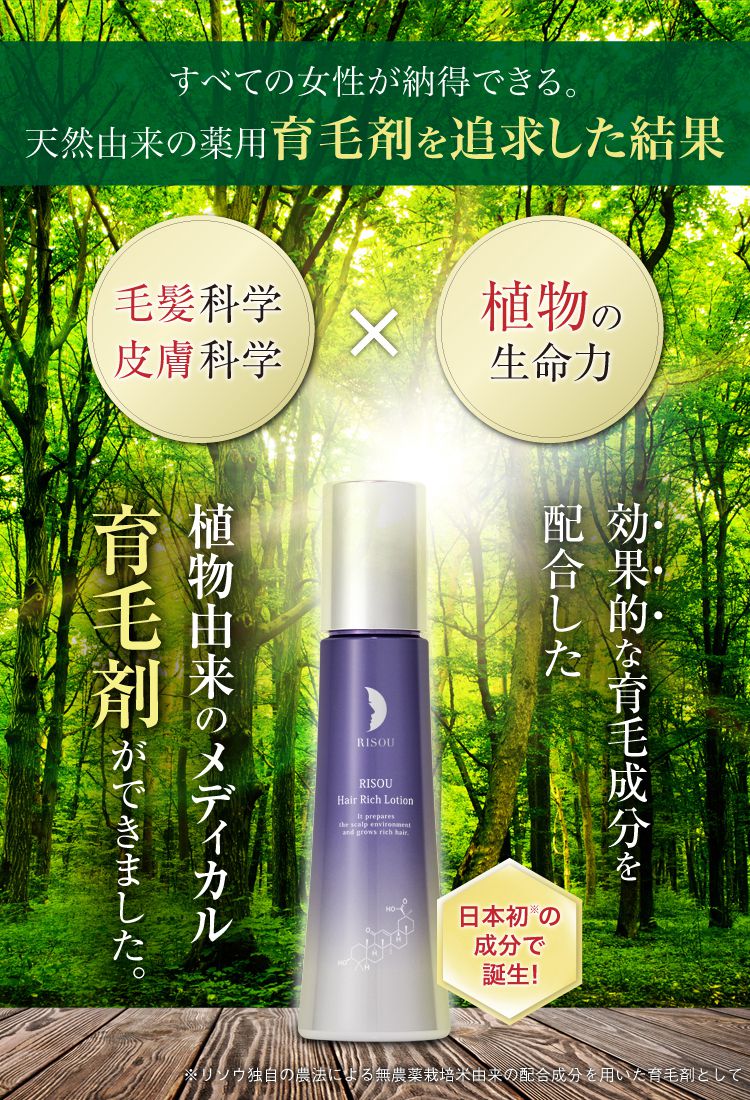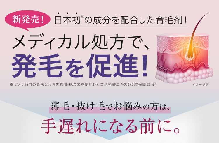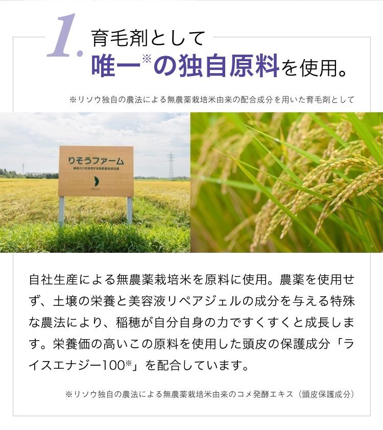 ※2:リソウ独自の農法による無農薬栽培米由来の配合成分を用いた育毛剤として