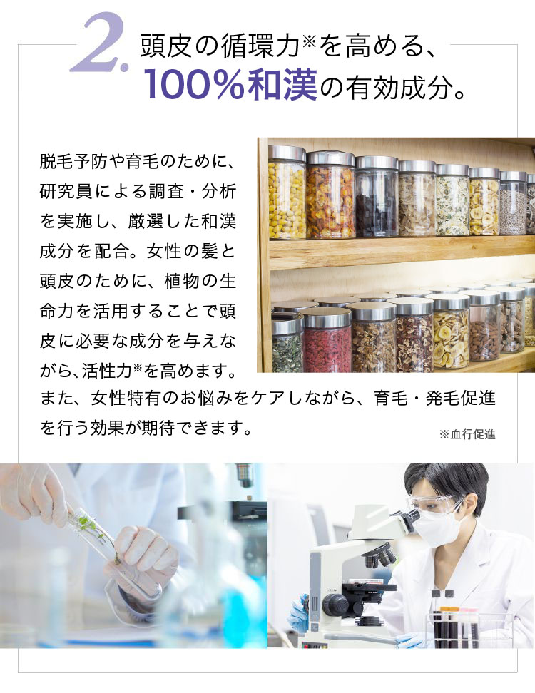日本初※1の成分「ライスエナジー100※2」や、頭皮の循環力を高める生薬を配合。