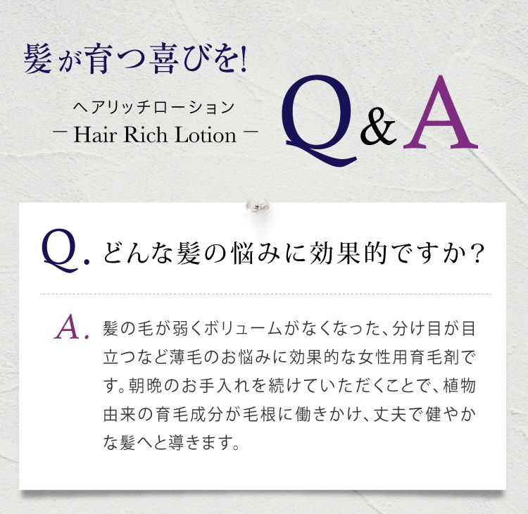 日本初※1の育毛剤 ウイッグが不要になった!と喜びの声も 日本初※1の成分「ライスエナジー100※2」と、頭皮の血行を高める和漢成分を配合した唯一の育毛剤。 医師の約90%が使用意向※3を示し、「ウイッグで隠していたのが不要になった」というご愛用者がいるほど。 「BEST BEAUTY AWARD※4」ではヘアケア部門と女性用育毛剤部門でW受賞を果たした話題の「天然由来の育毛剤」です。 【効能】発毛促進、育毛、毛生促進、養毛、薄毛対策、ふけ・かゆみ、脱毛の予防、病後・産後の脱毛 ※1:リソウ独自の農法による無農薬栽培米由来の配合成分を用いた育毛剤として ※2:リソウ独自の農法による無農薬栽培米を使用したコメ発酵エキス(頭皮保護成分) ※3:全国の医師150名のうち「ヘアリッチローションに興味がある」と回答した45名を対象にインターネットリサーチ方式でアンケートした結果、88.9%の医師が「ヘアリッチローション」を使用したいと回答。(2023年11月先端医療医学会) ※4:ポコチェ6月号2024/5/25 120ml(約45日分) 税抜8,000円(税 レビュー数 : 107 |