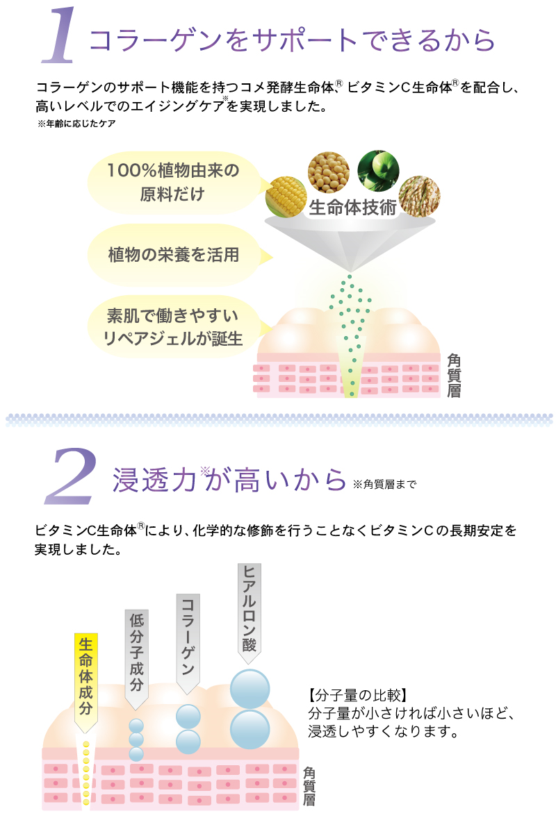 さらに2つの日本初※2成分、無農薬栽培米が原料の「コメ発酵生命体(R)」と、コラーゲンのサポートにより年齢肌を集中的にケアする「ビタミンC生命体(R)」を配合し、年齢より若く見える素肌を目指します。