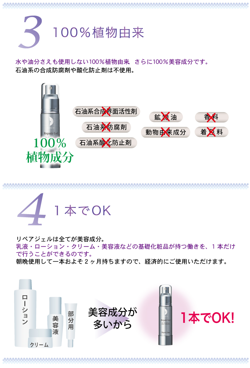 健康と安全を考えた健康補助食品並びに、天然成分の研究を行う原料メーカーとして誕生しました。その後、化粧品によるトラブルや効果に対して様々な疑問を持ち、独自の生命体技術を駆使した原料から成分の開発を行うことで、リペアジェルの誕生へと至ります。2010年にはそのリペアジェルを元に基礎化粧品・ヘアケア商品のリニューアル、さらにはファンデーションを開発し、生命体の効果と100%天然由来による優しさを併せ持った過去に例のない商品をお届けしております。