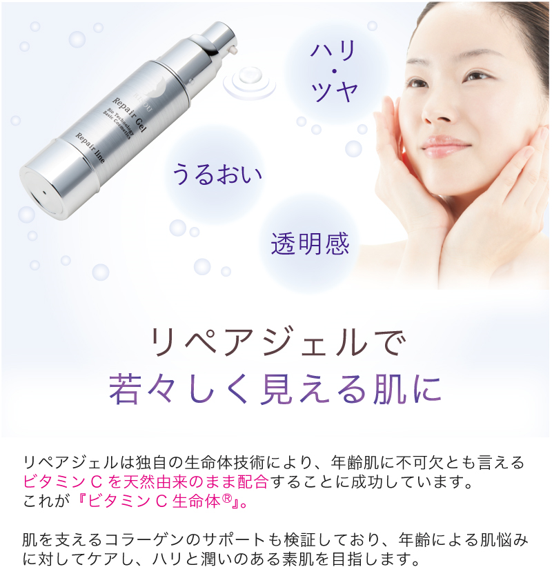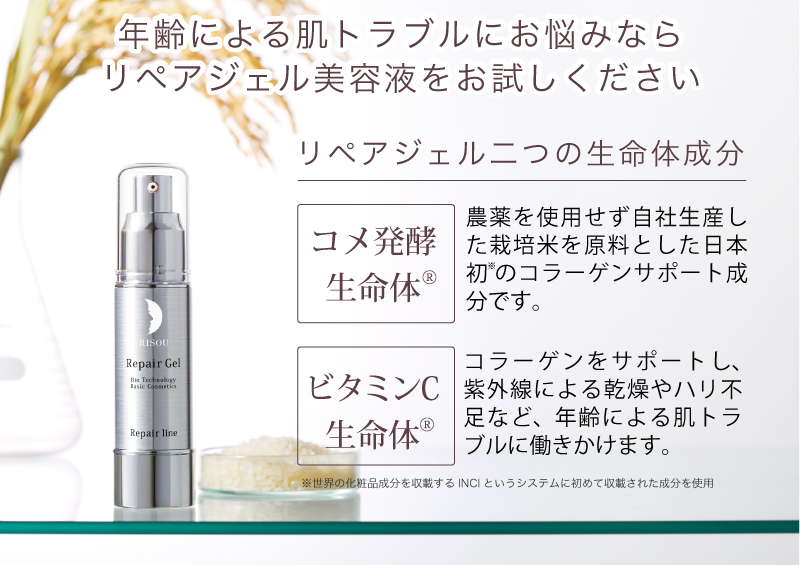 健康と安全を考えた健康補助食品並びに、天然成分の研究を行う原料メーカーとして誕生しました。その後、化粧品によるトラブルや効果に対して様々な疑問を持ち、独自の生命体技術を駆使した原料から成分の開発を行うことで、リペアジェルの誕生へと至ります。2010年にはそのリペアジェルを元に基礎化粧品・ヘアケア商品のリニューアル、さらにはファンデーションを開発し、生命体の効果と100%天然由来による優しさを併せ持った過去に例のない商品をお届けしております。