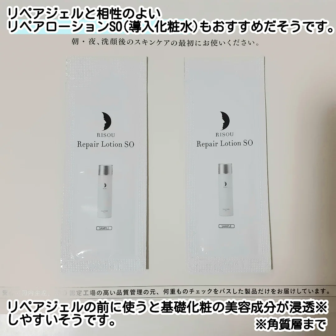 サンプルでいただいたリペアローションSO(導入化粧下地)をリペアジェルの前に使用するとより基礎化粧の美容成分が浸透※3しやすくなるそうです。