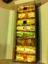 くるくるワッフル栗と、二口サイズにカットされたワッフル8種 カットワッフルは、たくさんの味を色々と試せるので楽しいですね その中でも私は、ほんのりほろ苦い抹茶味がお気に入り そして、くるくるワッフル栗は、カットと違ってクリームが中にたっぷりロールされていました 生クリーム… 2011/09/23