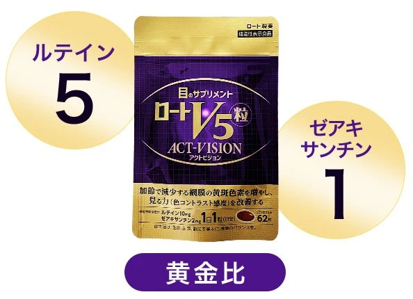 「ロートV5粒アクトビジョン」は、ルテイン・ゼアキサンチンを機能性関与成分として配合した目のサプリメントです。 レビュー数 : 142 |