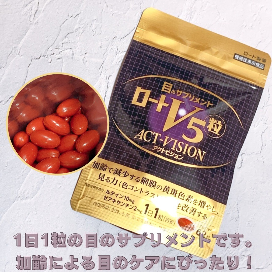 \目の健康に!/ ロートV5粒アクトビジョン ルテイン・ゼアキサンチンを機能性関与成分として配合し加齢で減少する網膜の黄斑色素を増やし見る力※1を改善✨ ※1 見る力とは、色コントラスト感度のこと 1日1粒(目安)で愛飲して1ヶ月、毎日PC作業をするのにこれのおかげか目の疲れが軽くなったように思います✨ 粒も小さめなので飲みやすさも◎ ✔ 目の健康が気になる方 ✔ 夕方になると目がぼやける方 ✔ 小さな文字が見えにくい方 そんなお悩みがある方には特におすすめです☺️ #ロートV5粒 #V5粒 #目の事ならロート製薬 #ロート製薬 #rohto #monipla #rohto_fan #美容 #美容垢さんと繋がりたい #美容垢さんフォロバします #アラフォーメイク #コスメ好きさんと繋がりたい #コスメオタク #コスメ購入品 #コスメレビュー #フォローミー