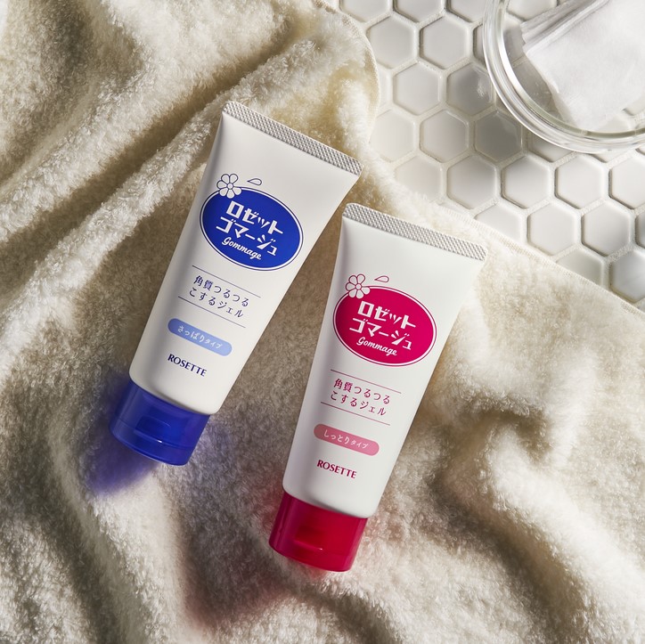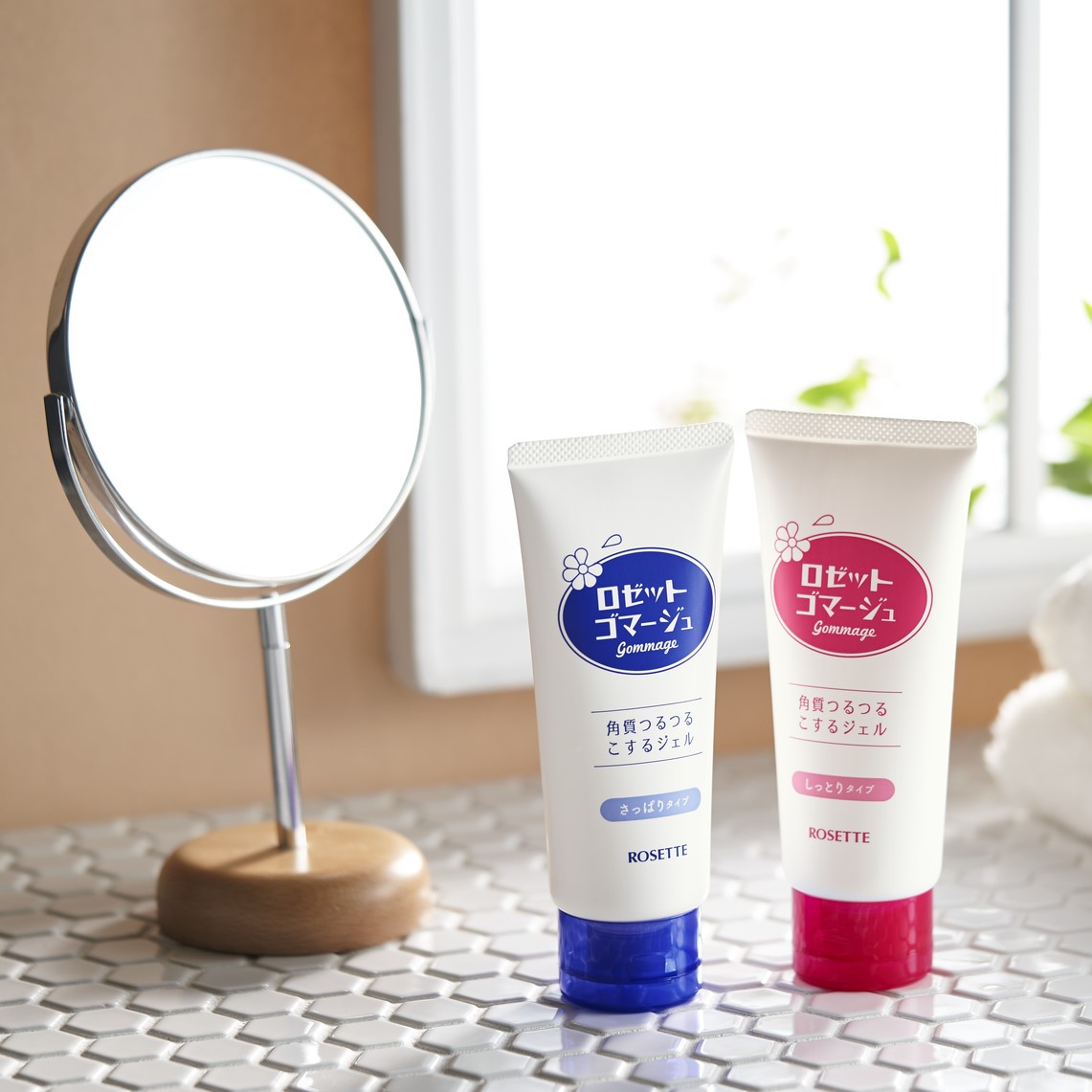ロゼットゴマージュは20年以上愛され続けるロングセラー商品。果実由来のAHA*1のはたらきでくすみ*2をポロポロ落とすピーリングジェルです。週に1~2回の使用で、メイクのりの良い肌へ。