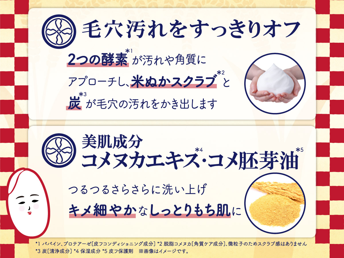 2つの酵素*3が汚れや古い角質にアプローチし、微粒子米ぬかスクラブ*1と炭*2が汚れをかき出し、毛穴汚れやくすみ*4をすっきりオフ。