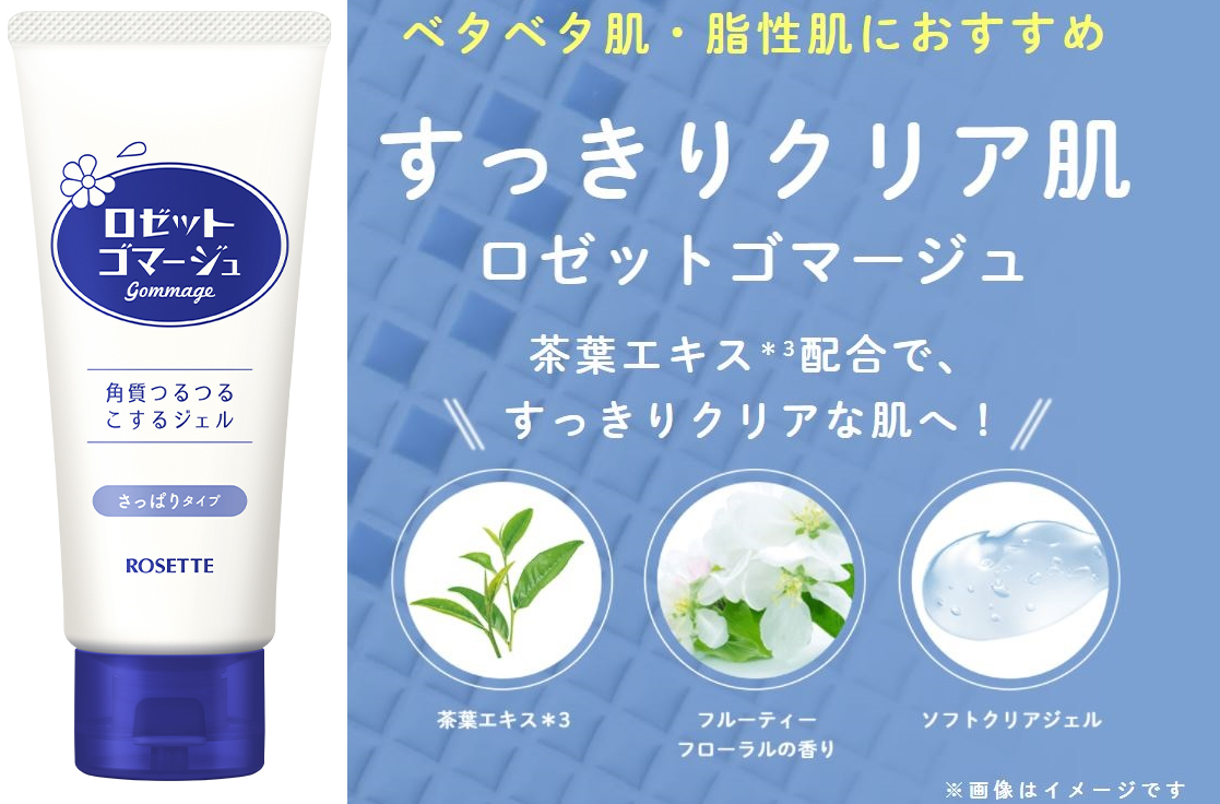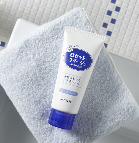 ロゼットゴマージュは20年以上愛され続けるロングセラー商品。果実由来のAHA*1のはたらきでくすみ*2をポロポロ落とすピーリングジェルです。週に1~2回の使用で、メイクのりの良い肌へ。