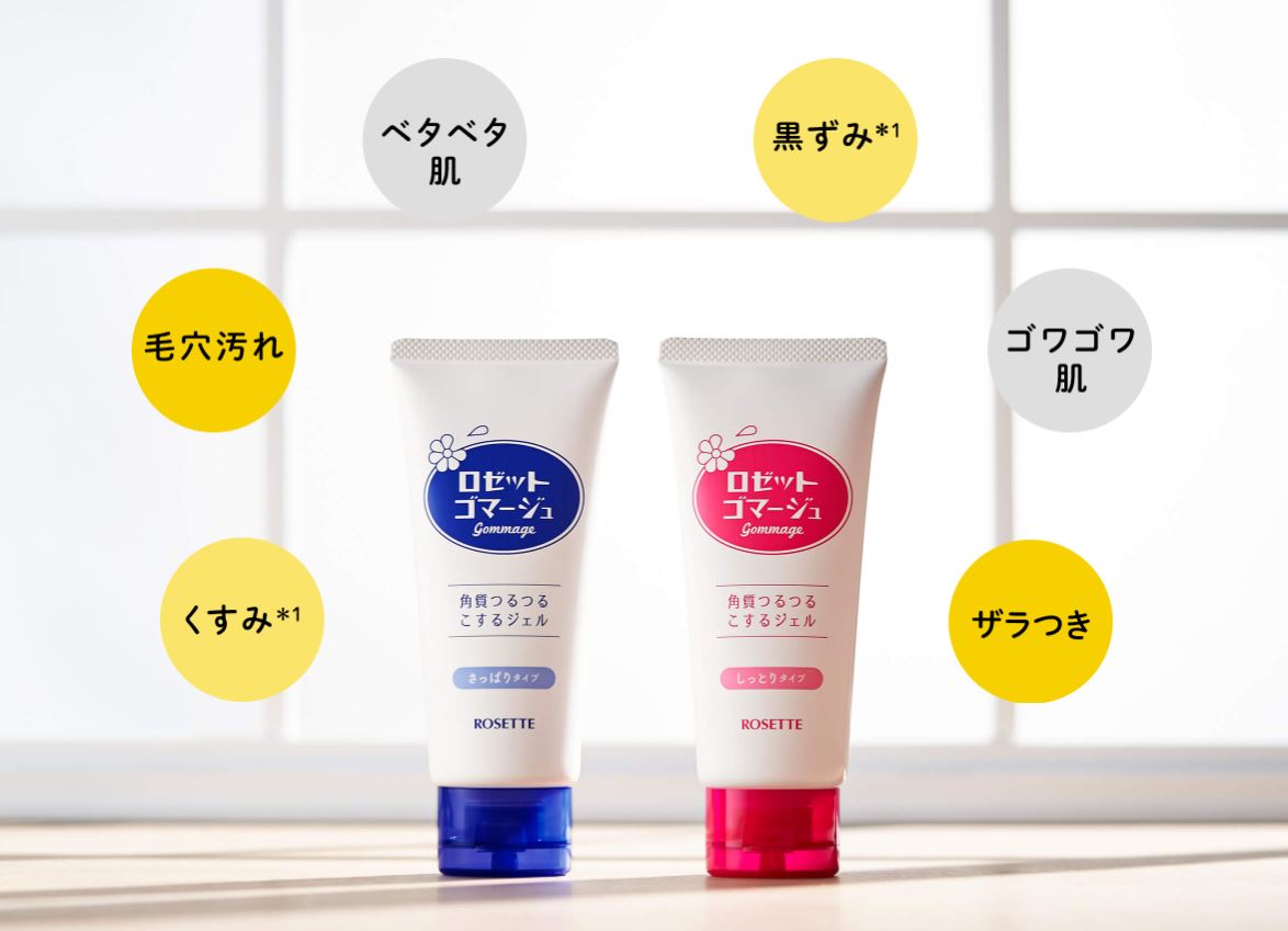 ロゼットゴマージュは20年以上愛され続けるロングセラー商品。果実由来のAHA*1のはたらきでくすみ*2をポロポロ落とすピーリングジェルです。週に1~2回の使用で、メイクのりの良い肌へ。