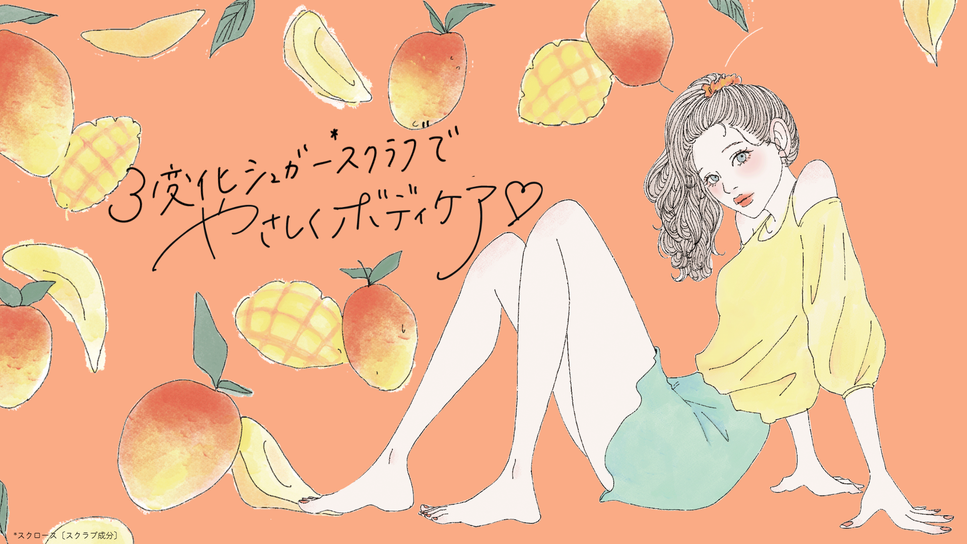 やわらかジューシーなツヤ肌で、毎日召しませボディ。ざく・じゅわ・ポロポロとテクスチャーが変化する新感覚のボディスクラブ。ざくざくしたシュガー*スクラブ in ジェルが肌の上でじゅわっととろけて、じんわり温かくなり、マッサージするとポロポロが古い角質をからめとります。洗い流した後は果実のようにみずみずしい、思わず触りたくなる肌へ。ざらつきが気になる二の腕、デコルテ、バスト、ヒップ、太ももなどのお手入れに。ジューシー&トロピカルなマンゴーの香り。