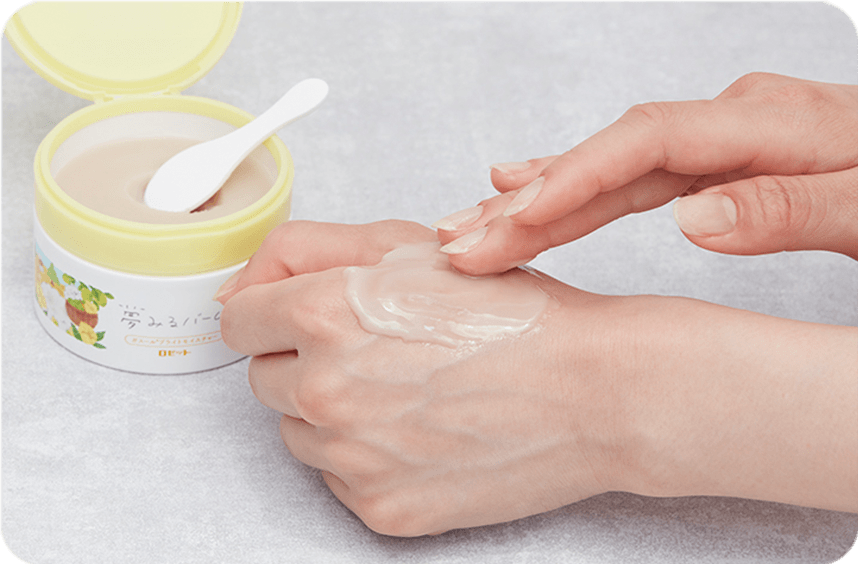 固形バームが肌でとろけてなめらかなテクスチャーに変化し、