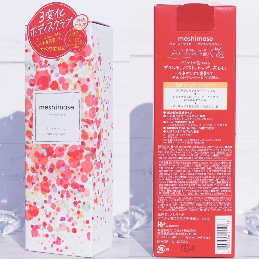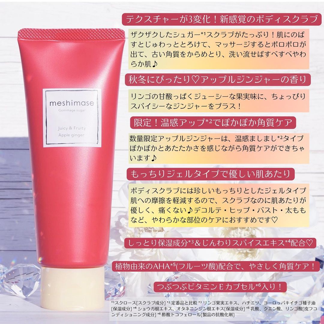 \秋冬にぴったり♡アップルジンジャーの香り/ ◾️ meshimase ゴマージュシュガー アップルジンジャー リンゴの甘酸っぱくジューシーな果実味にちょっぴりスパイシーなジンジャーをプラスした、ジューシー&フルーティーなアップルジンジャーの香りが数量限定で登場✨ ザクザクしたシュガー*1スクラブがたっぷりのもっちりとしたジェルタイプで、肌にのばすとじゅわっととろけます マッサージするとポロポロが出てきて、古い角質をからめとり、洗い流せばすべすべやわらか肌に♪ 大好きなゴマージュシュガーですが、この新作もすっごく良い香りです💕 パケもレッドで可愛いですが、香りも王道の女の子らしい甘い香りで、ほんのり香るジンジャーがほっとするような温かさを感じさせてくれます𓂃٭ やさしい肌あたりで摩擦感もほとんどない、ボディスクラブとしてはとても穏やかな使い心地なのでデコルテ・ヒップ・バスト・太ももなど、やわらかな部位のケアにもおすすめです☆ テクスチャー3変化のおかげかちゃんとツルツルすべすべのお肌になります◎ こちらは温感ましまし*2タイプとのことで、通常タイプより温かさを感じるのでこれからの季節にぴったり💓 プレゼントにもおすすめです♡ぜひチェックしてみてください♪ *1 スクロース[スクラブ成分] *2 定番品と比較 #PR #ロゼット株式会社 #ロゼット #rosette #meshimase #メシマセ #ゴマージュシュガー #meshimaseゴマージュシュガー #ボディケア #スクラブ #ボディスクラブ #シュガースクラブ #アップルジンジャーの香り #アップル #りんご #monipla #rosette_fan