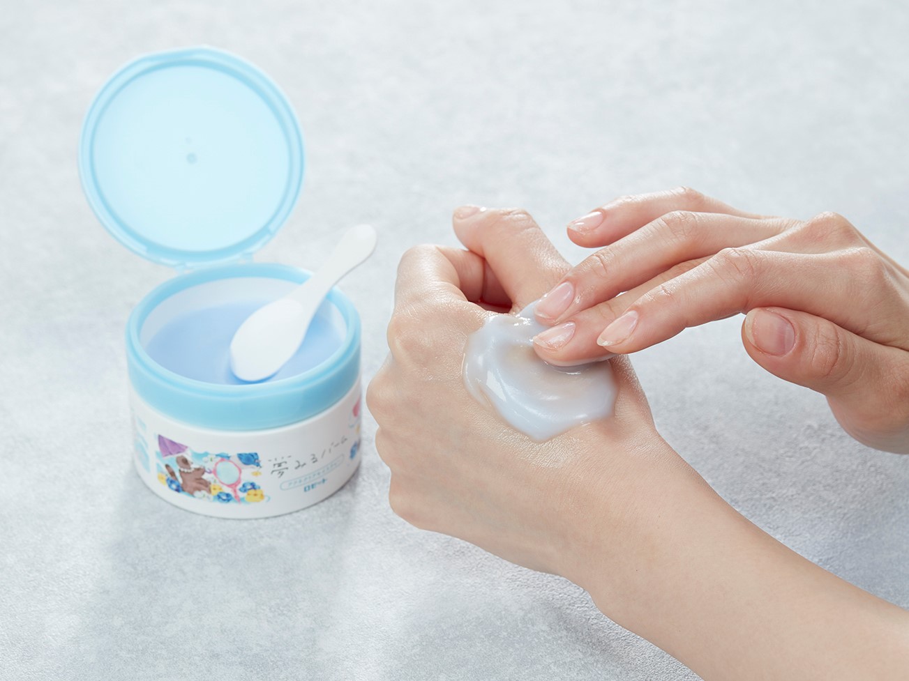 固形バームが肌でとろけてなめらかなテクスチャーに変化し、