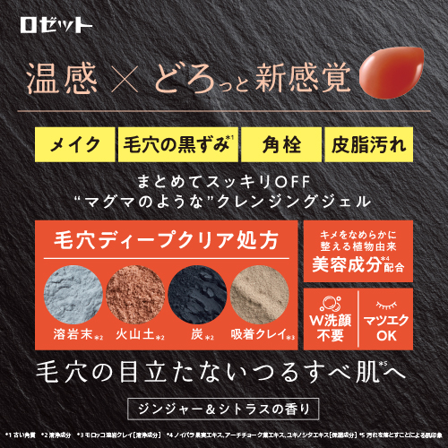 “マグマのような”どろっと温感クレンジングジェル。どろっと温感ジェル×4種のミネラルパウダー*¹の毛穴ディープクリア処方でじんわり肌をほぐしながら、ガンコな毛穴の黒ずみ*²・角栓・皮脂汚れもメイクもごっそり落とす。洗い上がりはつっぱらずすっきり、毛穴の目立たないつるすべ肌*³へ導きます。