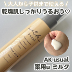薬用u ミルク 子どもから大人まで使えるスキンケアブランド『AK usual』さんから発売された乾燥肌用ミルク🎉 やわらかく、伸びの良いテクスチャーでお肌になじみやすいところがお気に入りです♡ しっとりとした使用感でありながら、べたつかないので、朝のスキンケアとしても使用しています🌈 乾燥が気になる部分にはたっぷり使用するのがお気に入りの使用方法です♪ ポンプタイプの容器だから使いやすく、使う分だけ手に出しやすいと感じました🌷 天然セラミド配合*だそうで、お肌にうるおいを与えてくれることを期待しています✨️ * ウマスフィンゴ脂質〔皮フ保護成分〕 #PR #ロゼット株式会社 #ロゼット #AKusual #セラミド #スキンケア #乾燥肌 #敏感肌 #低刺激 #monipla #rosette_fan #スキンケア #乾燥対策 #保湿ケア #コスメオタク #おしゃれさんと繋がりたい #スキンケア好きさんと繋がりたい #コスメ垢 #美容垢 #화장품 #화장품추천 #뷰티 #메이크업 #스킨케어 #화장품스타그램 #미용 #소통 #피부관리 #뷰티스타그램 #코덕 2025/05/14