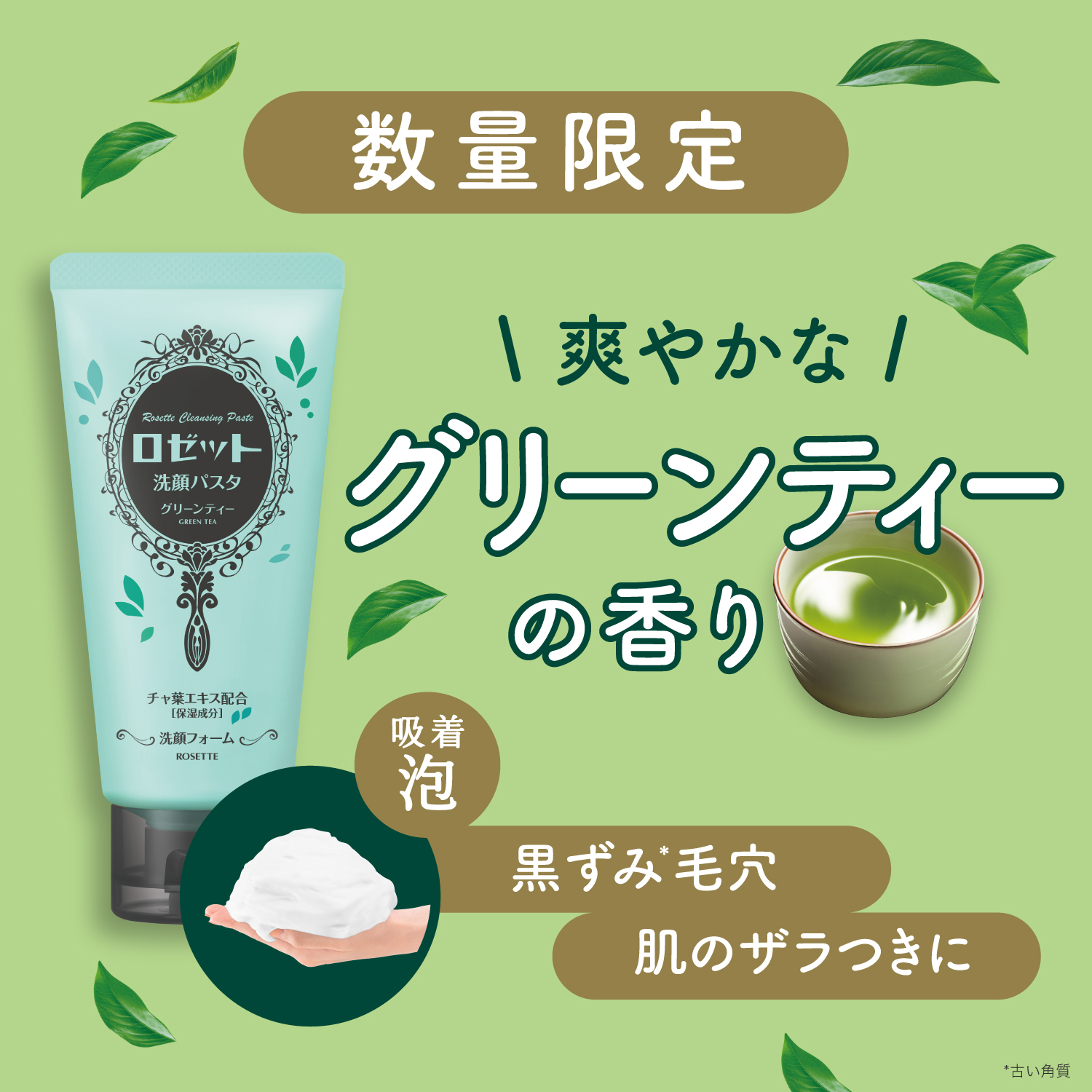 ロゼットが誇るロングセラー洗顔ブランド「ロゼット洗顔パスタ」のクレイシリーズ。肌悩みに合わせたキメ細かなクレイパウダー*を独自の製法で練り込み、豊かな泡立ちと心地よい洗い上がりが特長の洗顔料です。数量限定で新登場!爽やかなグリーンティーが香る洗顔フォーム。きめ細かなもっちり濃密泡が、余分な皮脂や毛穴奥の汚れを吸着し、すっきりつるつる肌に。 * 清浄成分