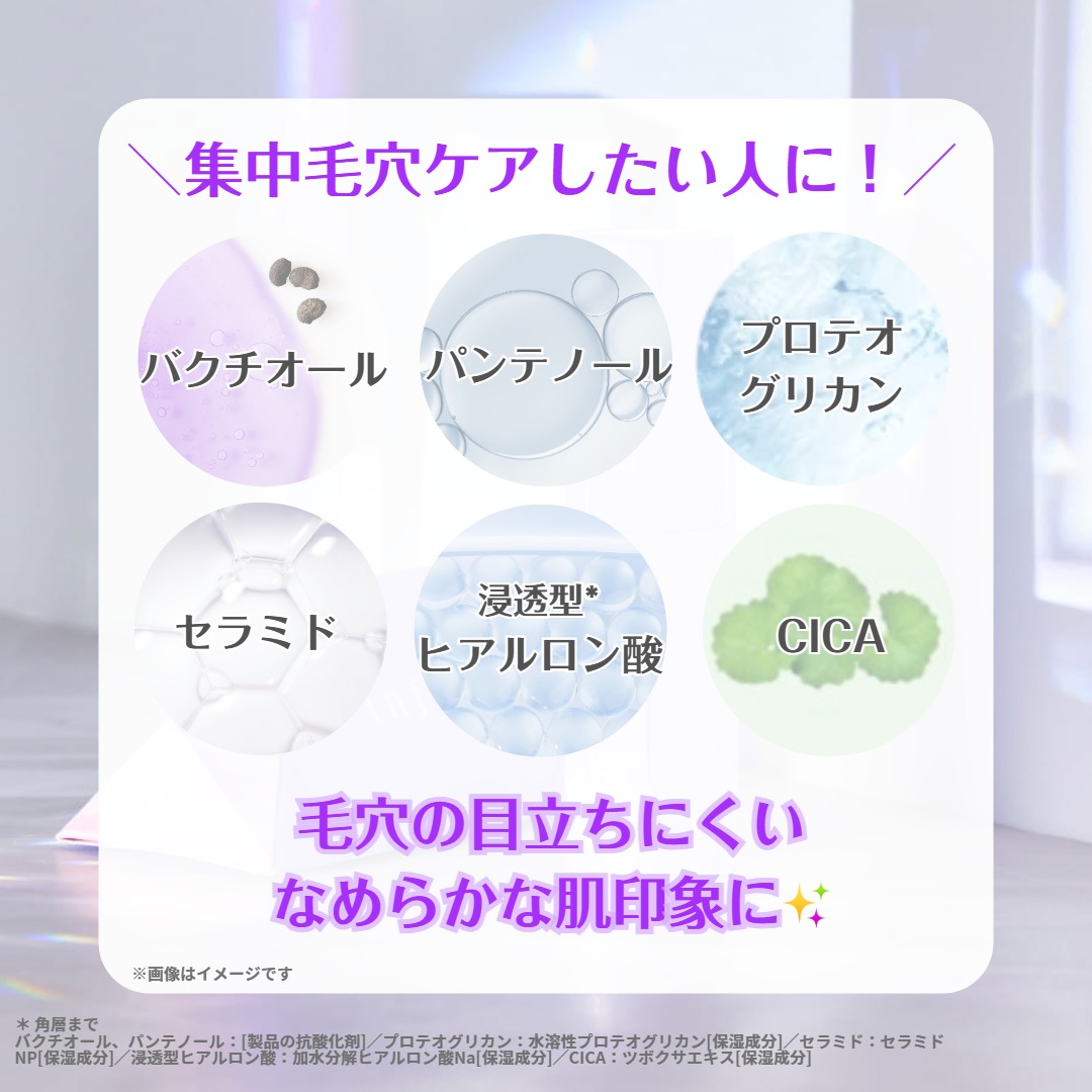 バクチオール*⁷・パンテノール*⁷・セラミド*⁸を配合。毛穴の目立ちにくいなめらかな肌印象に導きます。
