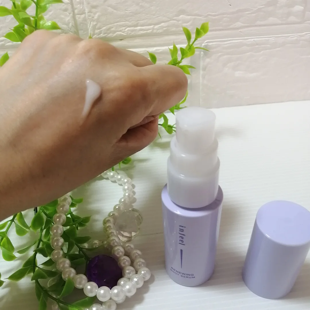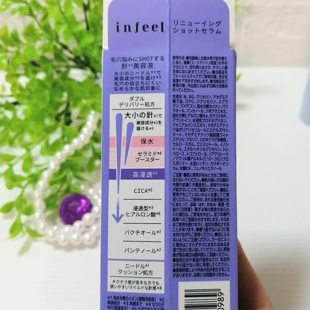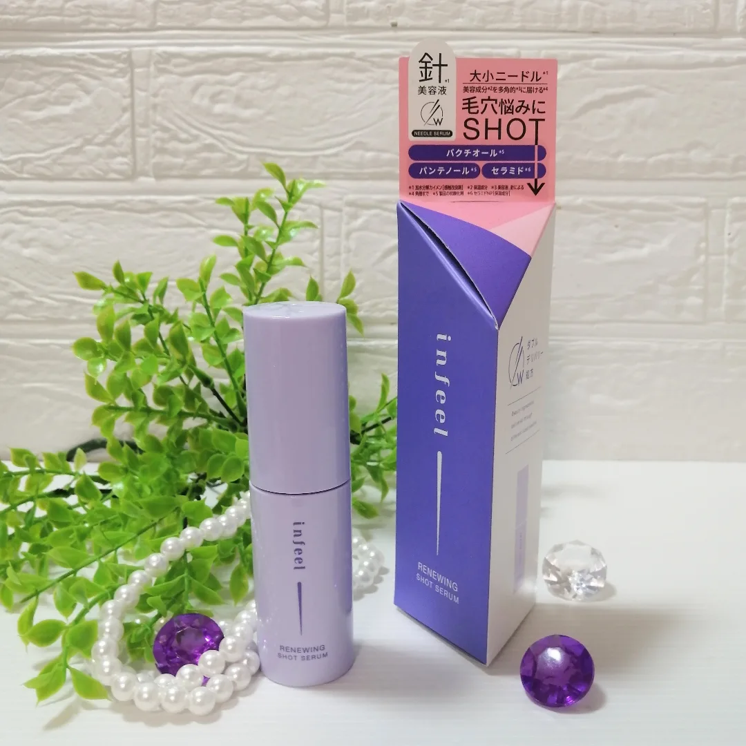 ✨ infeel リニューイングショットセラム ★毛穴悩みにSHOTする針*¹美容液★ 大小異なるサイズの針*¹配合で 美容成分*²を多角的*³に肌に届ける*⁴美容液です。 私は小鼻の毛穴が気になっています。 こちらはバクチオール*⁵・パンテノール*⁵・セラミド*⁶などの成分が配合されていて毛穴の目立ちにくいなめらかな肌印象に導いてくれるというのがうれしいですね。 洗顔後、化粧水のあとに使います。 プッシュ式なので使いやすいです。 私は2プッシュ使用で、目のまわりはさけてお顔に広げています。 少しチクチクする程度なので使いやすいなと思いました。 香りはとくに感じなかったです。 べとつきもなく軽い感じなのもよかったです。 *1 加水分解カイメン[感触改良剤] *2 保湿成分 *3 美容液・針による *4 角層まで *5 製品の抗酸化剤 *6 セラミドNP[保湿成分] #PR #ロゼット株式会社 #ロゼット #rosette #infeel #リニューイングショットセラム #毛穴 #インフィール #monipla #rosette_fan