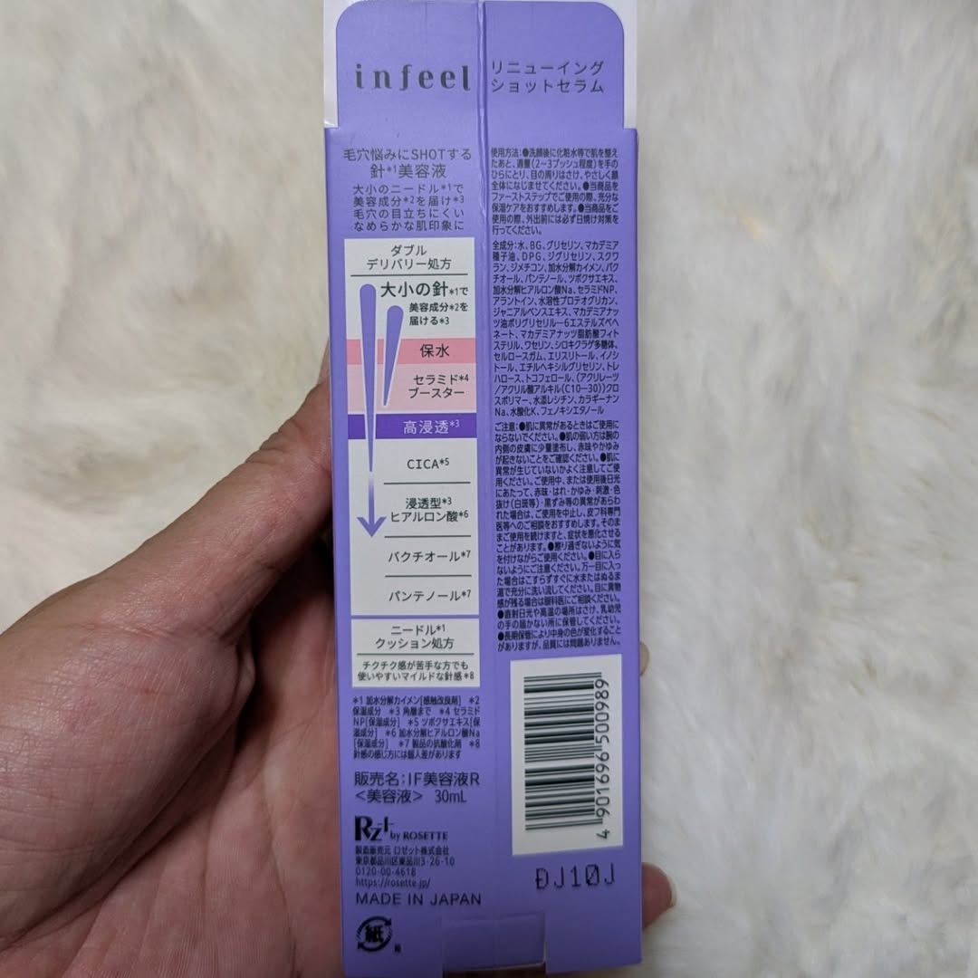 #PR infeel リニューイングショットセラム 【毛穴悩みにSHOTする針*¹美容液】 大小異なるサイズの針*¹配合。美容成分*²を多角的*³に肌に届ける*⁴美容液。 針*¹成分約750,000本配合*⁵を配合しながら、チクチク感が苦手な方でも使いやすいマイルドな針感*⁶が特徴です! バクチオール*⁷・パンテノール*⁷・セラミド*⁸を配合。毛穴の目立ちにくいなめらかな肌印象に導きます。 *1 加水分解カイメン[感触改良剤] *2 保湿成分 *3 美容液・針による *4 角層まで *5 1製品あたり *6 針感の感じ方には個人差があります *7 製品の抗酸化剤 *8 セラミドNP[保湿成分] ちょっとチクチク感がありましたが、 痛く感じるほどではなかったので 私は使えました! (苦手な方は少しずつの方がいいかもです。) 使い続けて毛穴レス肌目指したいと思います。 #PR #ロゼット株式会社 #ロゼット #rosette #infeel #リニューイングショットセラム #毛穴 #インフィール #monipla #rosette_fan