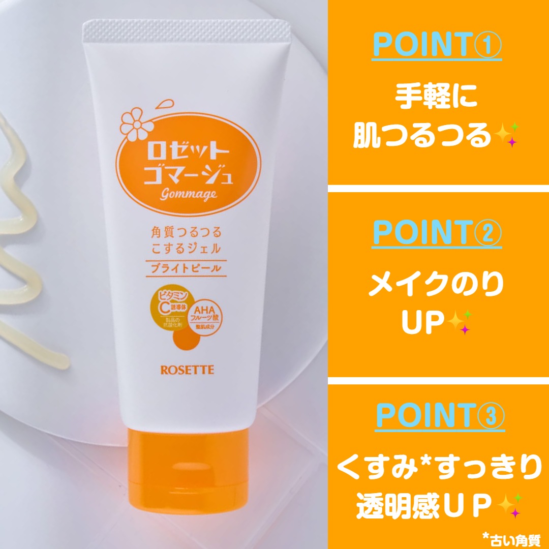ロゼットゴマージュ ブライトピール @rosette.official 日頃の洗顔だけでは落としきれない 不要な角質をオフしてくれる ピーリングジェルです。 クリアピールとブライトピールの2種展開で、 こちらのブライトピールは ビタミンC誘導体*配合です。 *アスコルビン酸硫酸2Na(製品の抗酸化剤) 透明のみずみずしいテクスチャーのジェル。 くるくるとお肌に馴染ませていくと ポロポロに変化していくのが楽しいよね。 すっきりとした使い心地が気持ちいいですよ! #PR #ロゼット株式会社 #ロゼット #rosette #monipla 2026/01/12