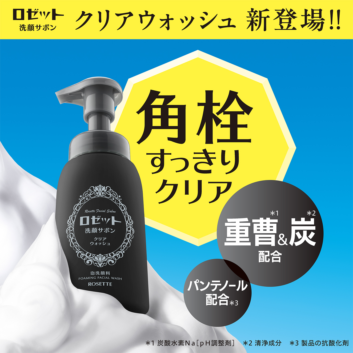 *1 自社泡洗顔料において *2 炭酸水素Na[pH調整剤] *3 清浄成分 *4 製品の抗酸化剤