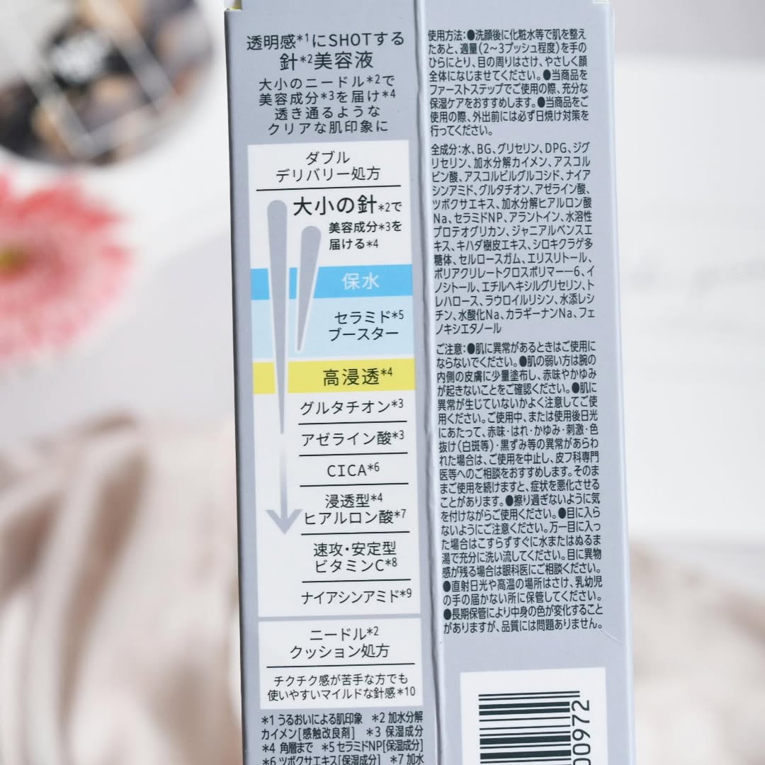 【透明感*¹にSHOTする針*²美容液】 大小異なるサイズの針*²配合。美容成分*³を多角的*⁴に肌に届ける*⁵美容液。 針*²成分約600,000本配合*⁶を配合しながら、チクチク感が苦手な方でも使いやすいマイルドな針感*⁷が特徴です! 速攻・安定型ビタミンC*⁸・グルタチオン*³・ナイアシンアミド*⁹を配合。透き通るようなクリアな肌印象に導きます。 *1 うるおいによる肌印象 *2 加水分解カイメン[感触改良剤] *3 保湿成分 *4 美容液・針による *5 角層まで *6 1製品あたり *7 針感の感じ方には個人差があります *8 アスコルビン酸、アスコルビルグルコシド[製品の抗酸化剤] *9 製品の抗酸化剤