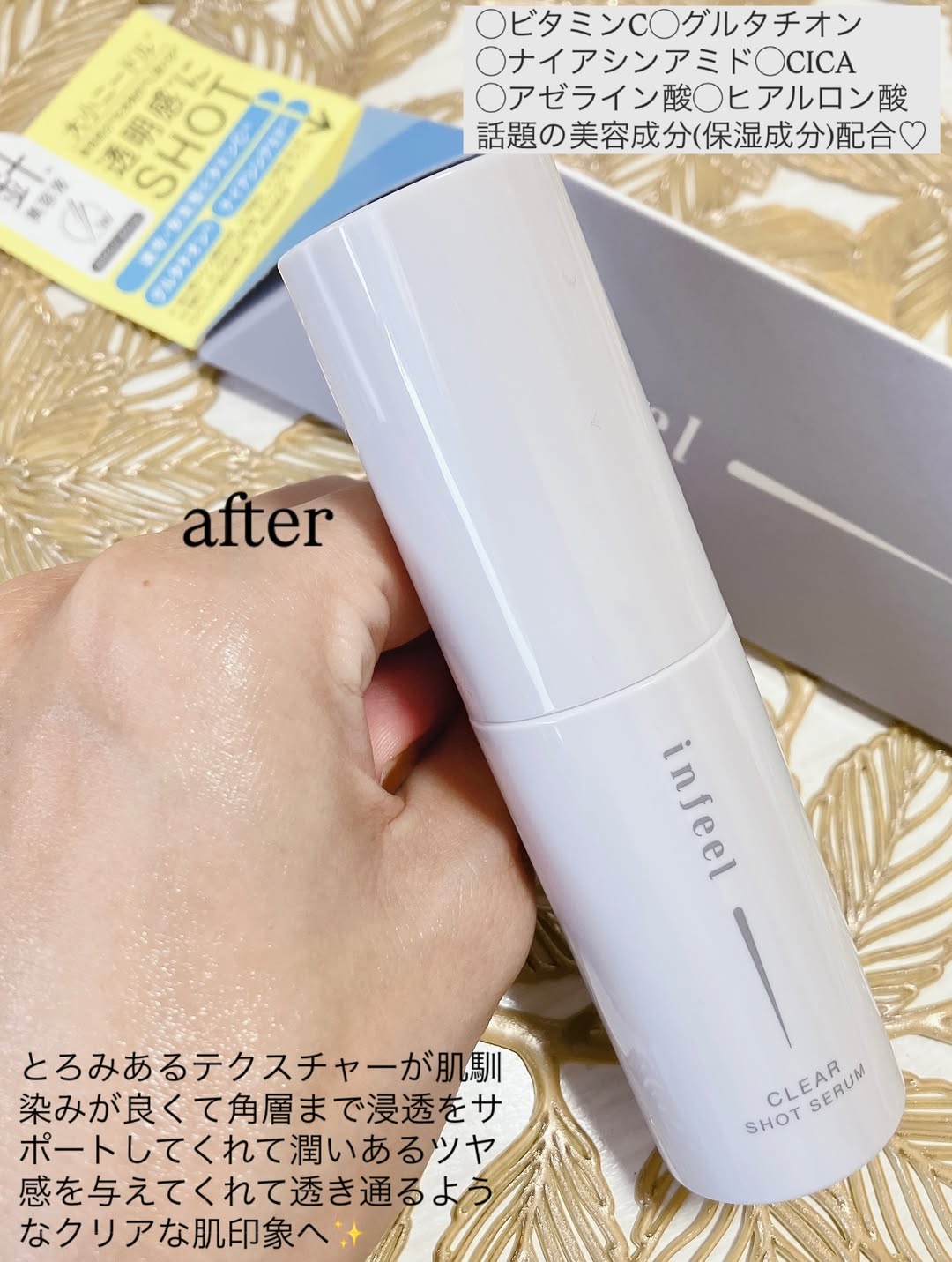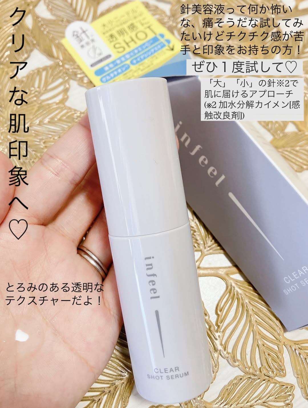 【透明感*¹にSHOTする針*²美容液】 大小異なるサイズの針*²配合。美容成分*³を多角的*⁴に肌に届ける*⁵美容液。 針*²成分約600,000本配合*⁶を配合しながら、チクチク感が苦手な方でも使いやすいマイルドな針感*⁷が特徴です! 速攻・安定型ビタミンC*⁸・グルタチオン*³・ナイアシンアミド*⁹を配合。透き通るようなクリアな肌印象に導きます。 *1 うるおいによる肌印象 *2 加水分解カイメン[感触改良剤] *3 保湿成分 *4 美容液・針による *5 角層まで *6 1製品あたり *7 針感の感じ方には個人差があります *8 アスコルビン酸、アスコルビルグルコシド[製品の抗酸化剤] *9 製品の抗酸化剤